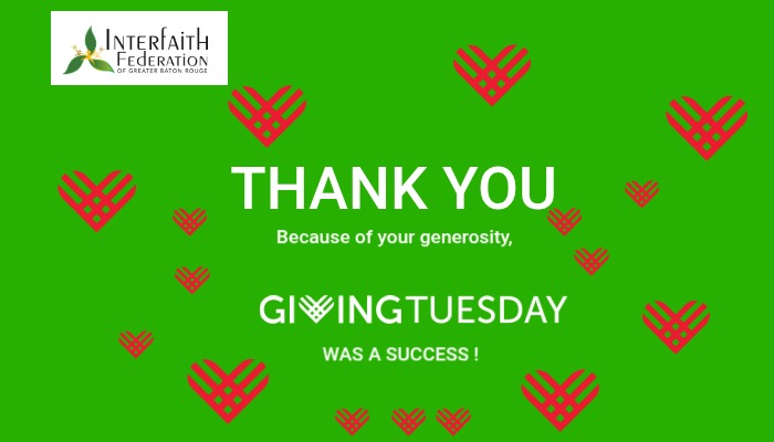 Thank you to all of our friends and partners who gave gifts of love and hope as part of our Giving Tuesday campaign. So far, we have received gifts of about $4000 to help us continue our work to cultivate peace, justice, and unity in Baton Rouge. If you missed the Giving Tuesday campaign, our work and your financial support are needed every day of the year so gifts are always appreciated. Donations may be made either online or by mail. Thank you to all of our generous partners joining our collaborative efforts to wage peace in the greater Baton Rouge area.